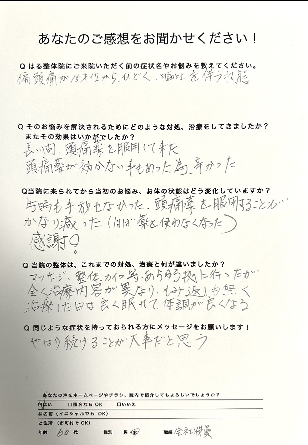 以前通っていた病院は、頭痛を薬で一時的に痛みをなくす対処をしていたのですが、はる整体院さんでは頭痛の原因を突き止め、根本的な施術を行うので、一時的なものではなく、長期的に痛みがなくなり、薬を飲む必要もなくなりました。